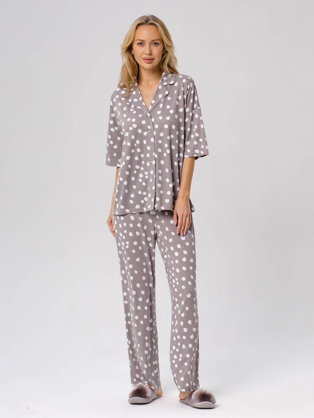 Этот комплект пижамы состоит из рубашки с короткими рукавами и длинных брюк. Рубашка выполнена в свободном стиле с отложным воротником и пуговицами, что придает ей уютный и расслабленный вид. Брюки имеют удобный крой и эластичный пояс, обеспечивая комфорт при носке. Этот комплект идеально подходит для домашнего отдыха и сна, создавая ощущение уюта и стиля.