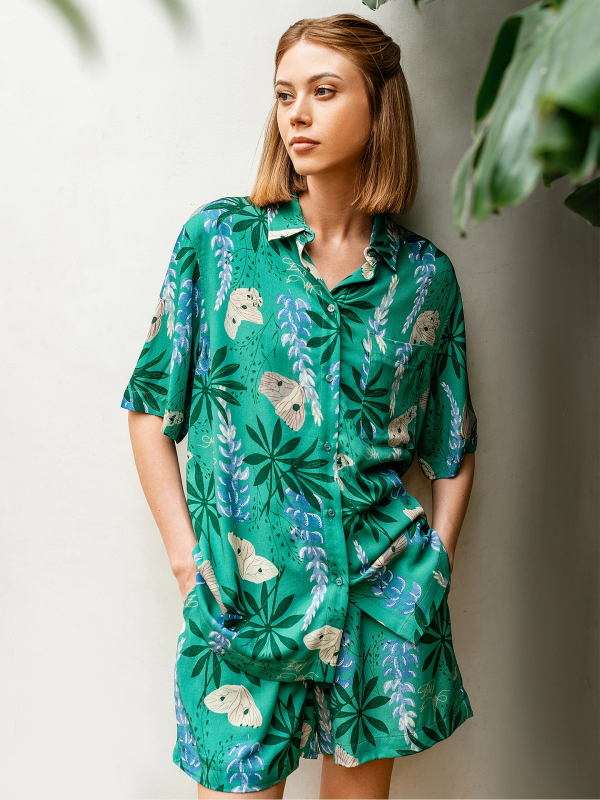 Шорты женские свободного силуэта из ткани. На детали переда карманы с отрезным бочком.