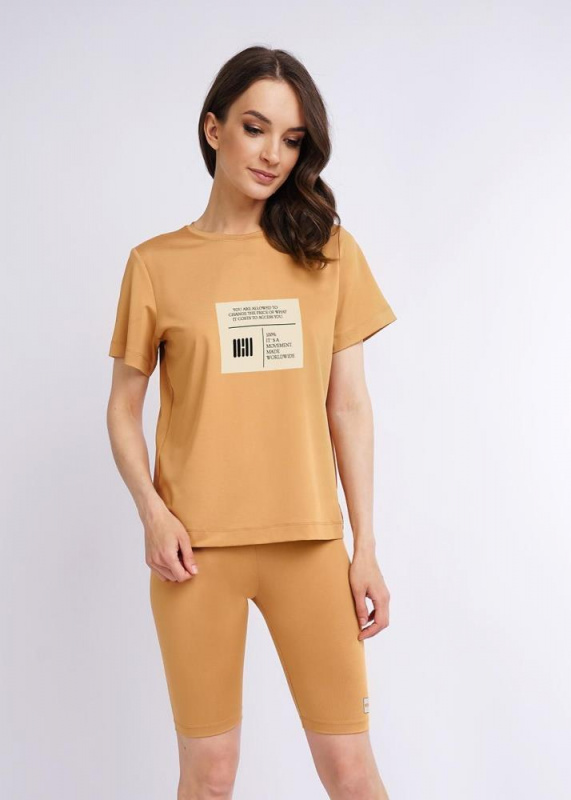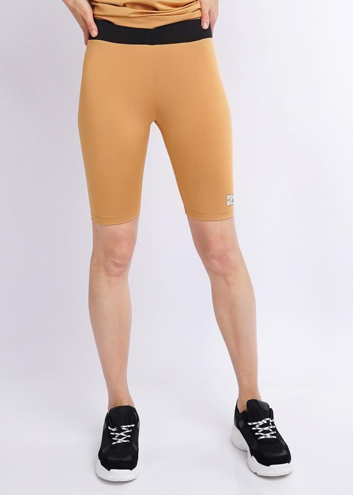 Велосипедки из полиэстера с широким контрастным поясом с принтом-термопленкой на ножке спереди.