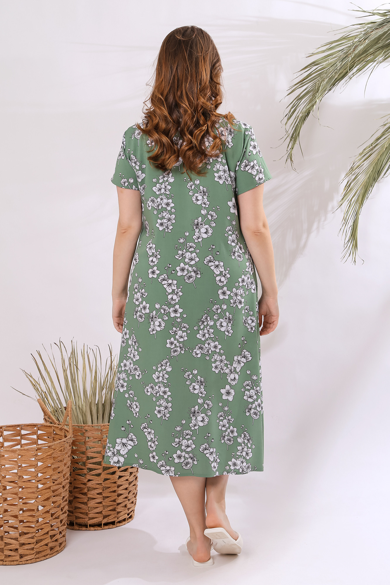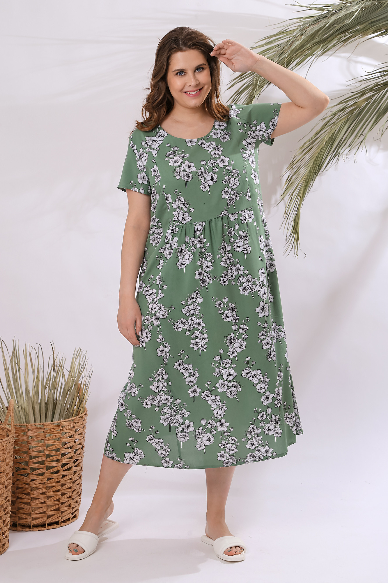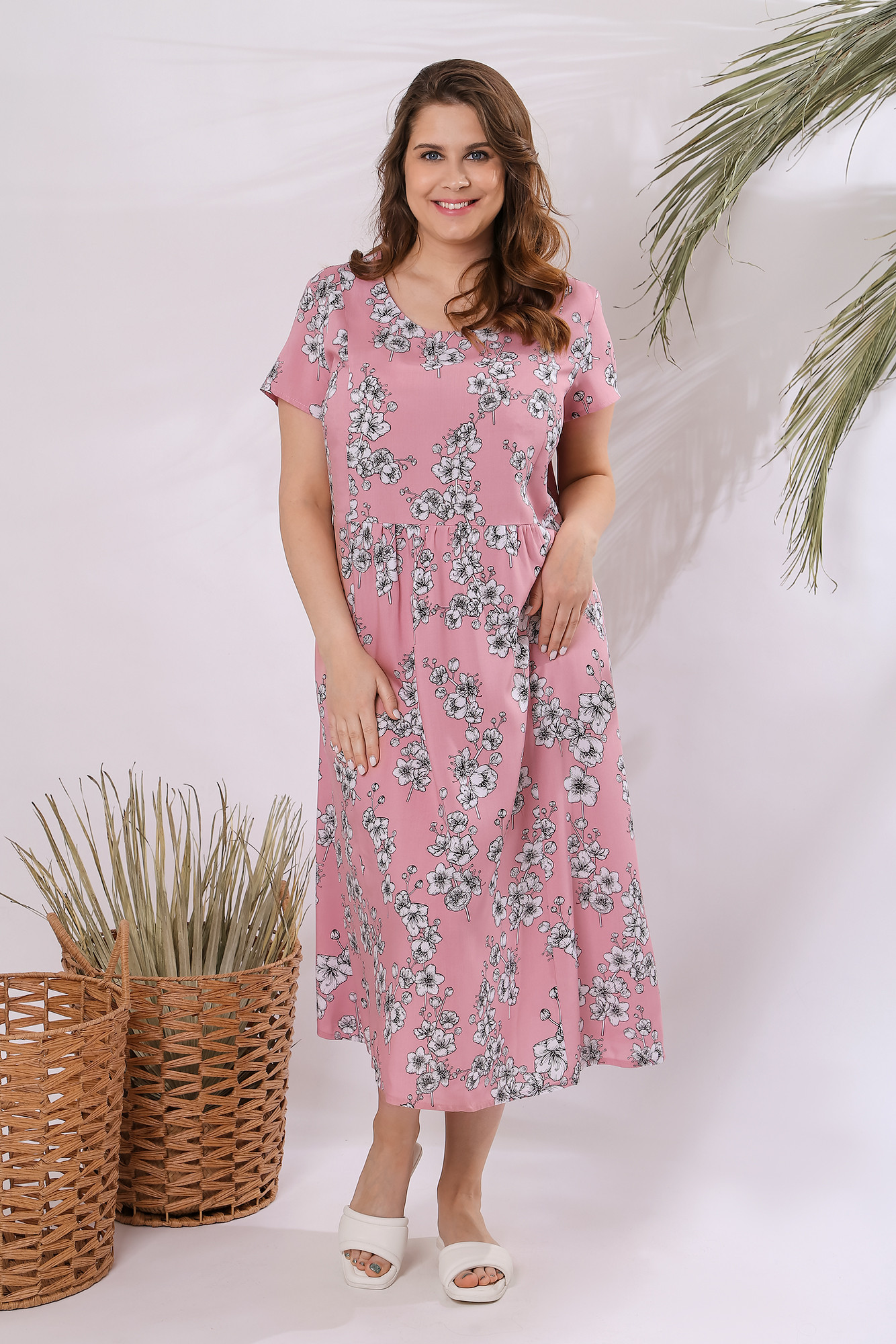 Платье женское из плательной штапельной ткани с набивным цветочным рисунком, свободного кроя, удлиненное, короткими втачными рукавами, округлой горловиной.